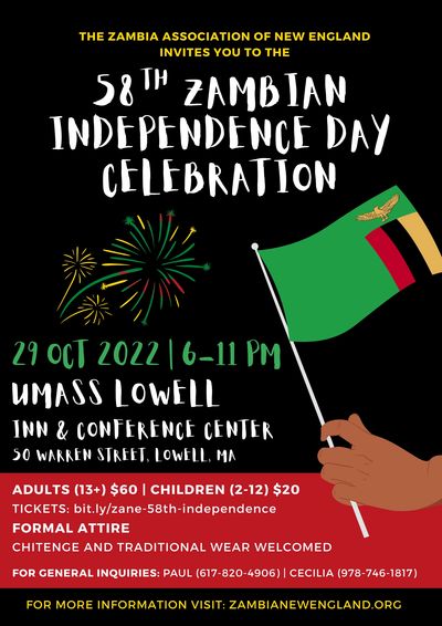 Join members of the Zambia Association of New England to celebrate Zambia's 58th year of independence! The celebration will include dinner, a cash bar, music, and a long awaited opportunity to catch up with the community since the start of the pandemic.