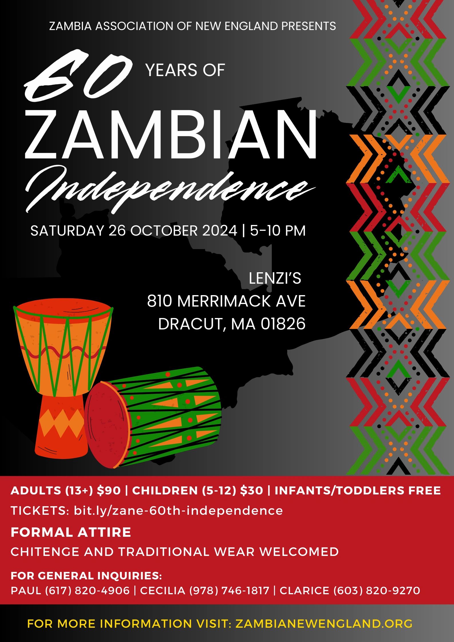 Join members of the Zambia Association of New England to celebrate Zambia's 60th year of independence! The celebration will include dinner, a cash bar, music, and good company!