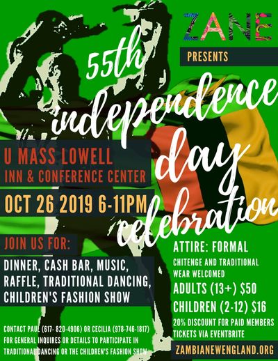 Join members of the Zambia Association of New England to celebrate Zambia's 55th year of independence! The celebration will include dinner, a cash bar, music, traditional dancing, a children's fashion show, and a fundraising raffle.